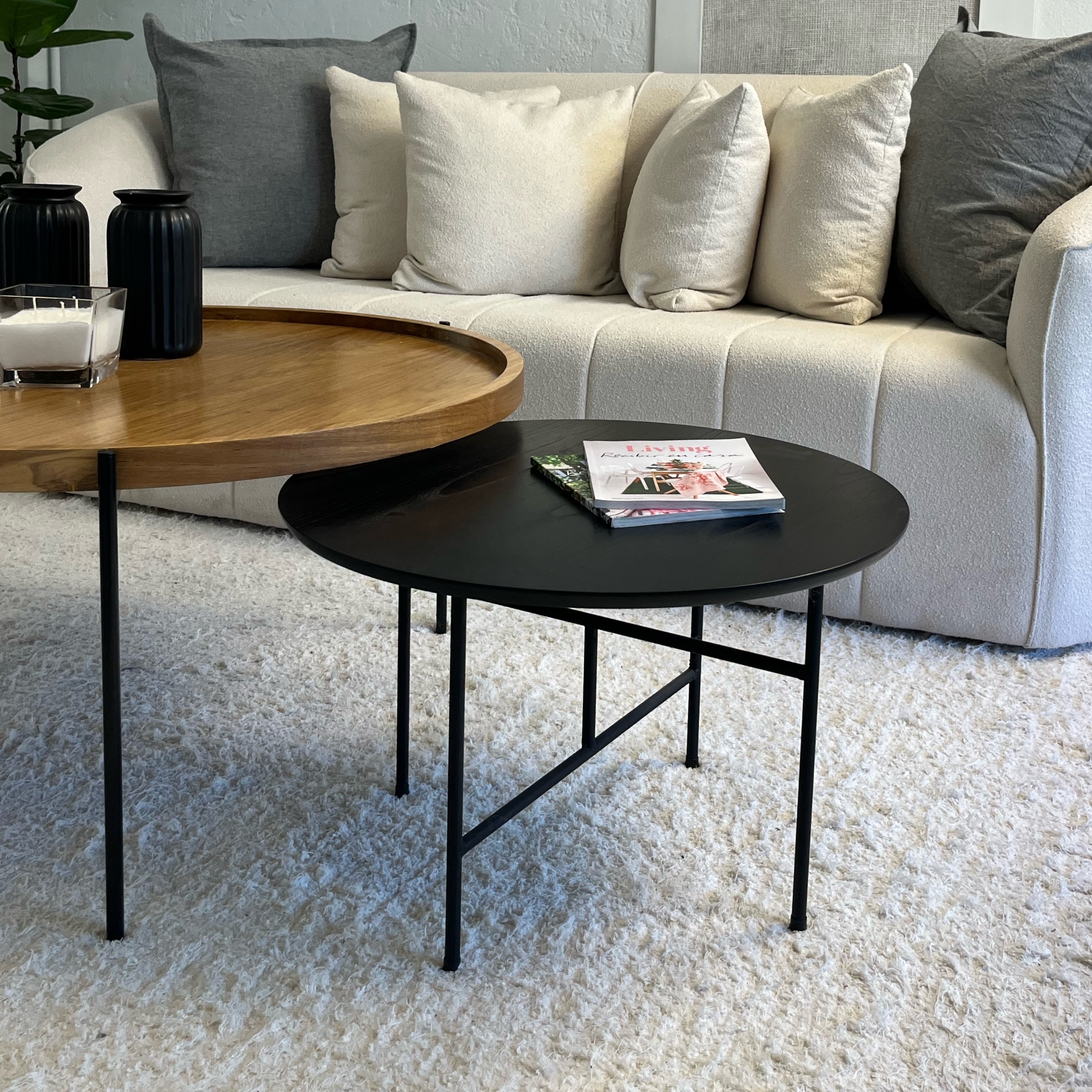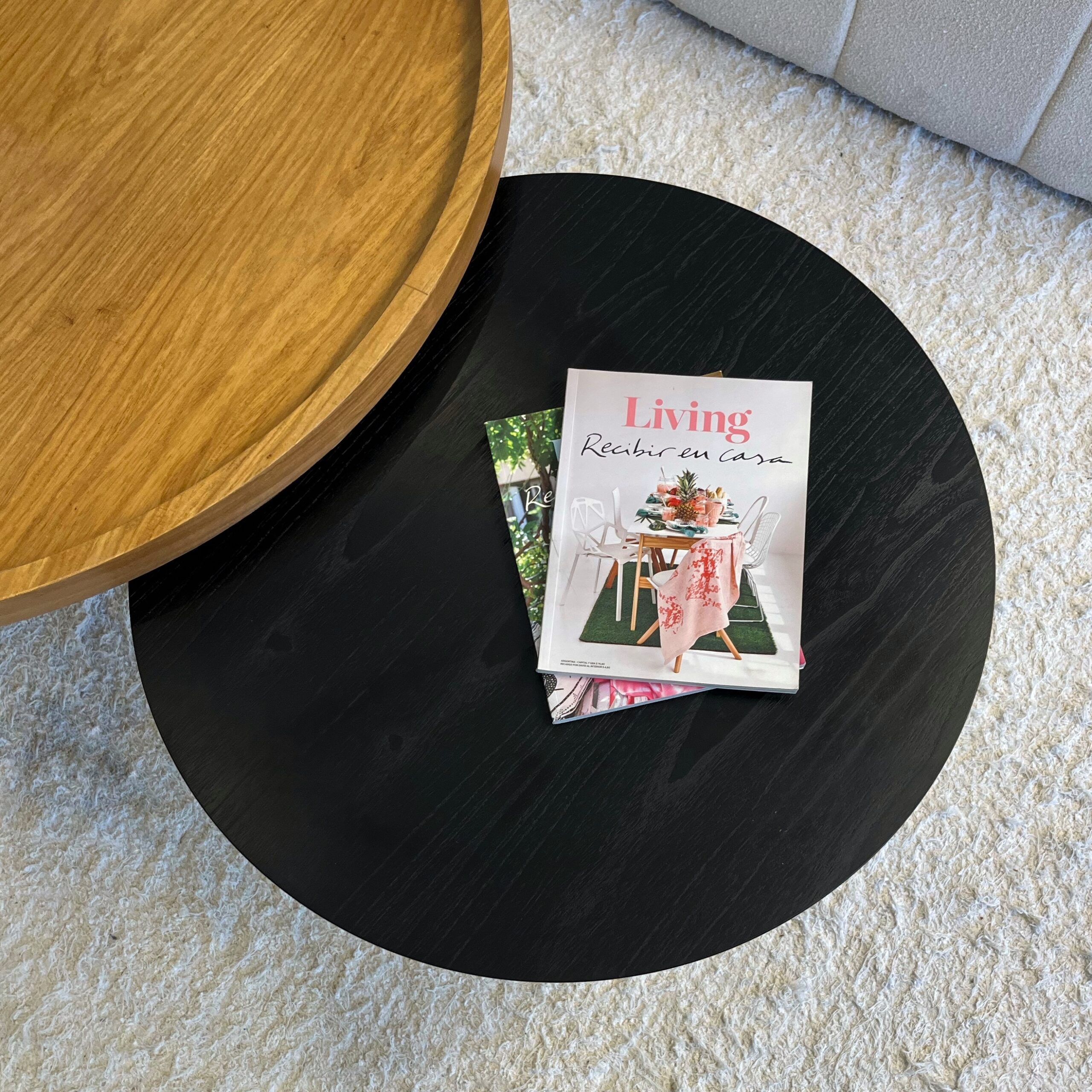 De diseño contemporáneo y carácter natural, esta mesa combina una tapa redonda de madera con una estructura de hierro que le aporta firmeza y estilo. Su mezcla de materiales crea un equilibrio perfecto entre lo cálido y lo industrial, ideal para complementar livings modernos o espacios con personalidad.