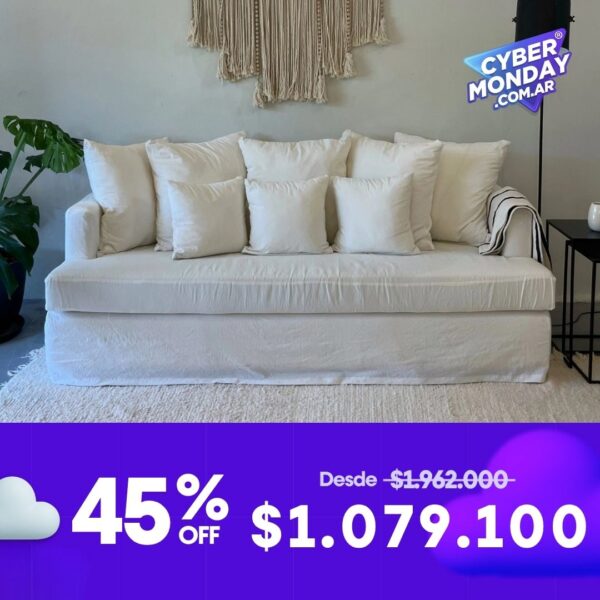 Sofá con Funda, con tres rasgos distintivos: sus apoyabrazos delgados y retraídos, el asiento de placa entera y su respaldo compuesto por 5 almohadones más grandes y 3 más pequeños. Disponible en género y color a elección entre lienzo rústico Off White y lienzo rústico Off Cream.