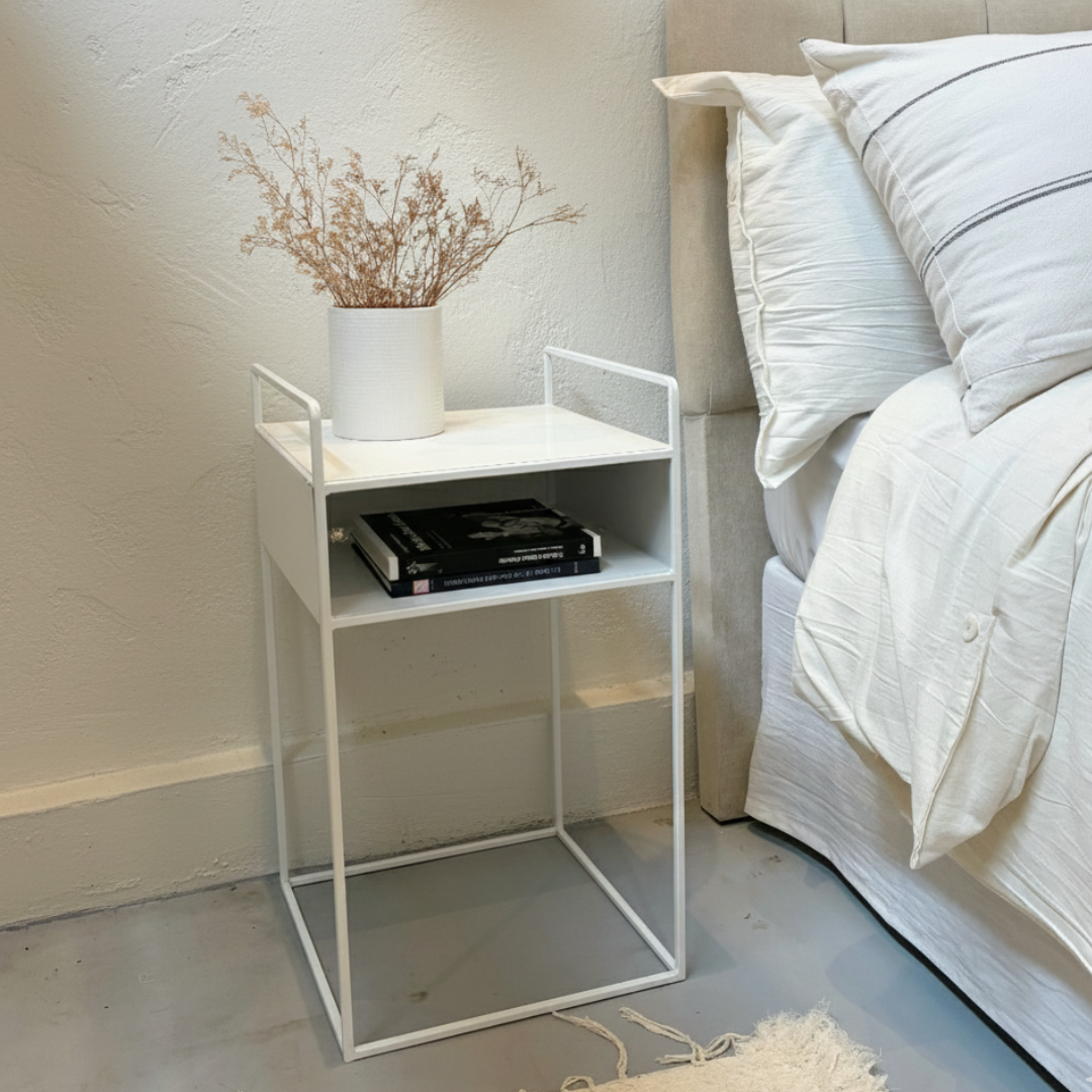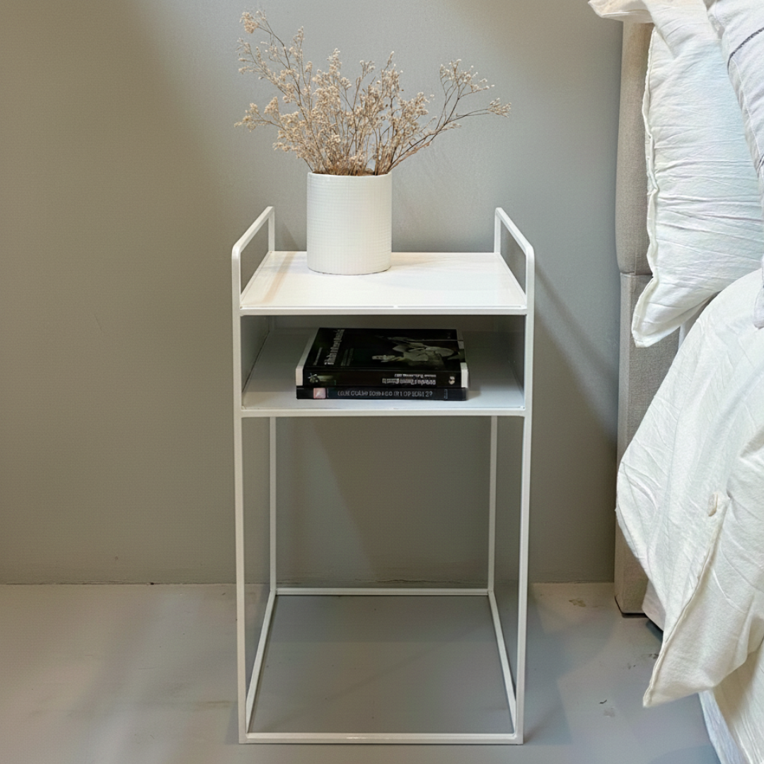 Mesa de Luz de hierro con un estante, de lineas simples y funcionales. Puede ser negra o Blanca.
