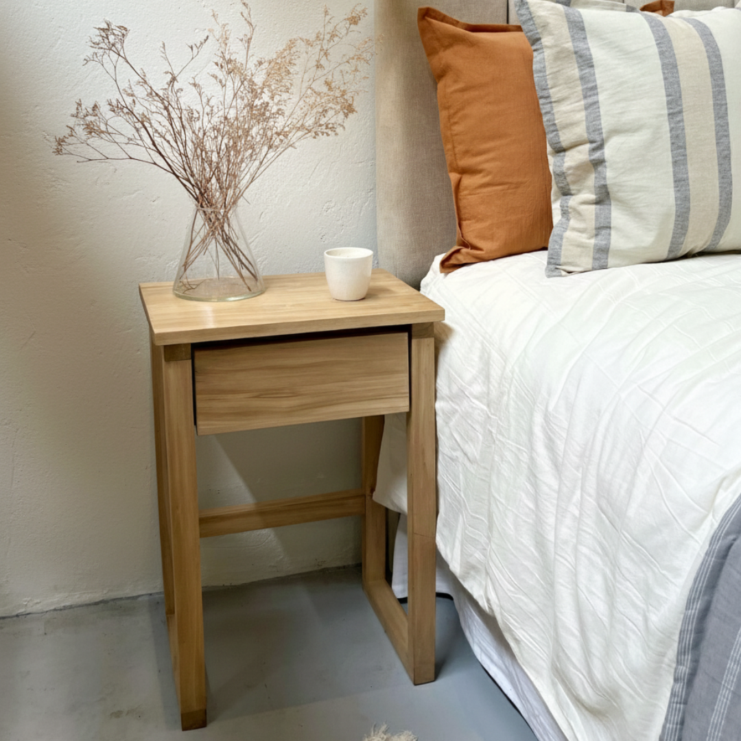 Mesa de luz modelo Wood con 1 cajón. Realizada en madera maciza de álamo.