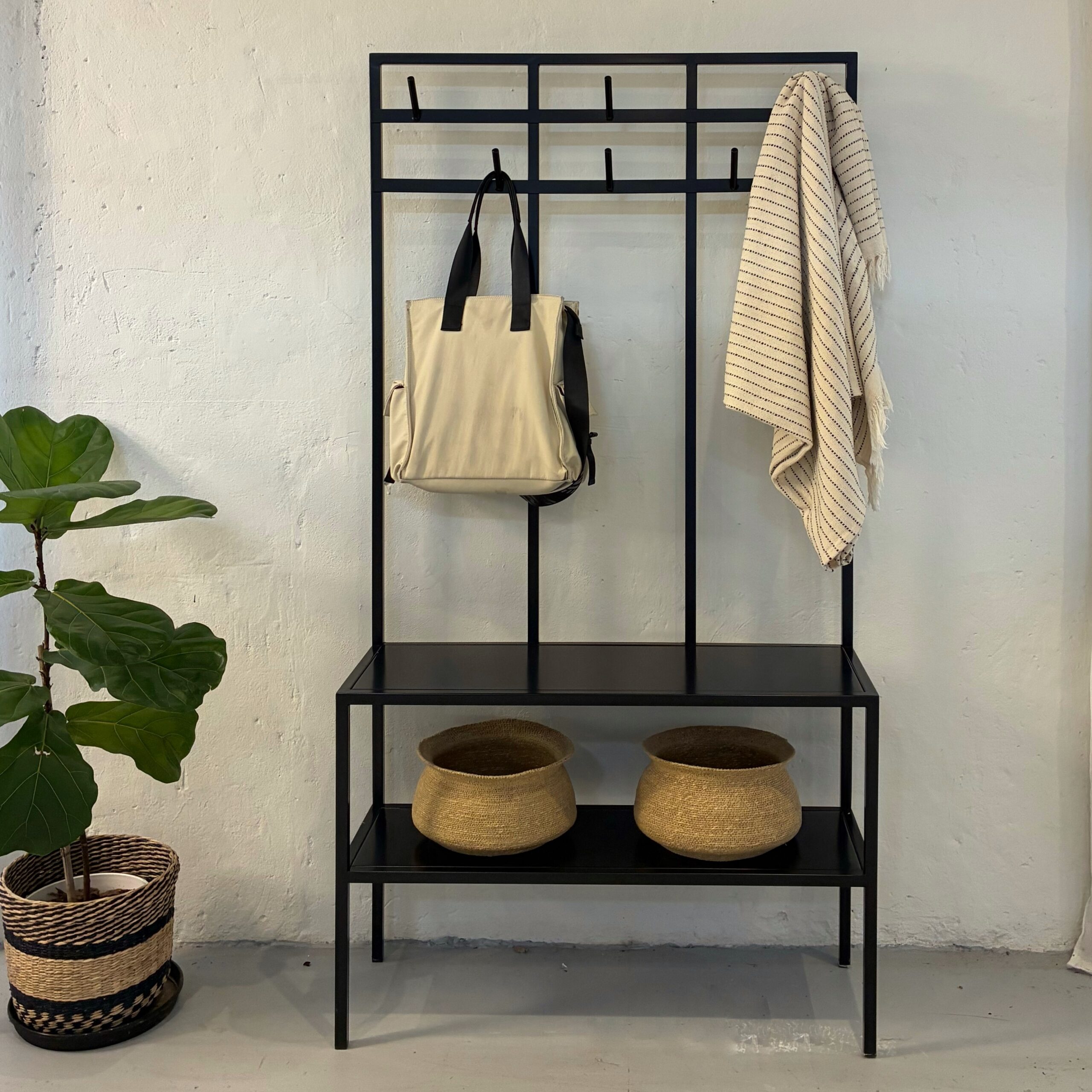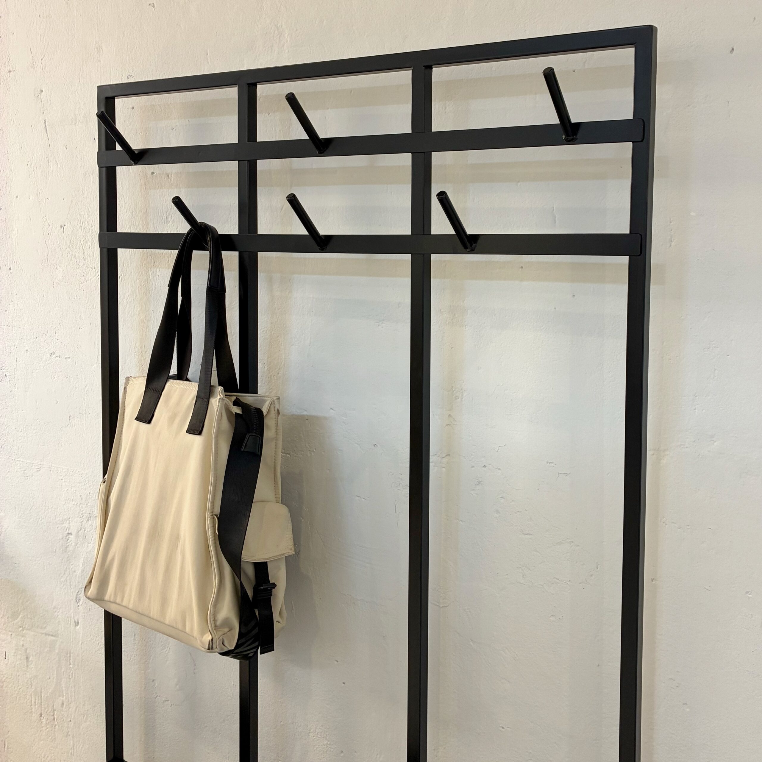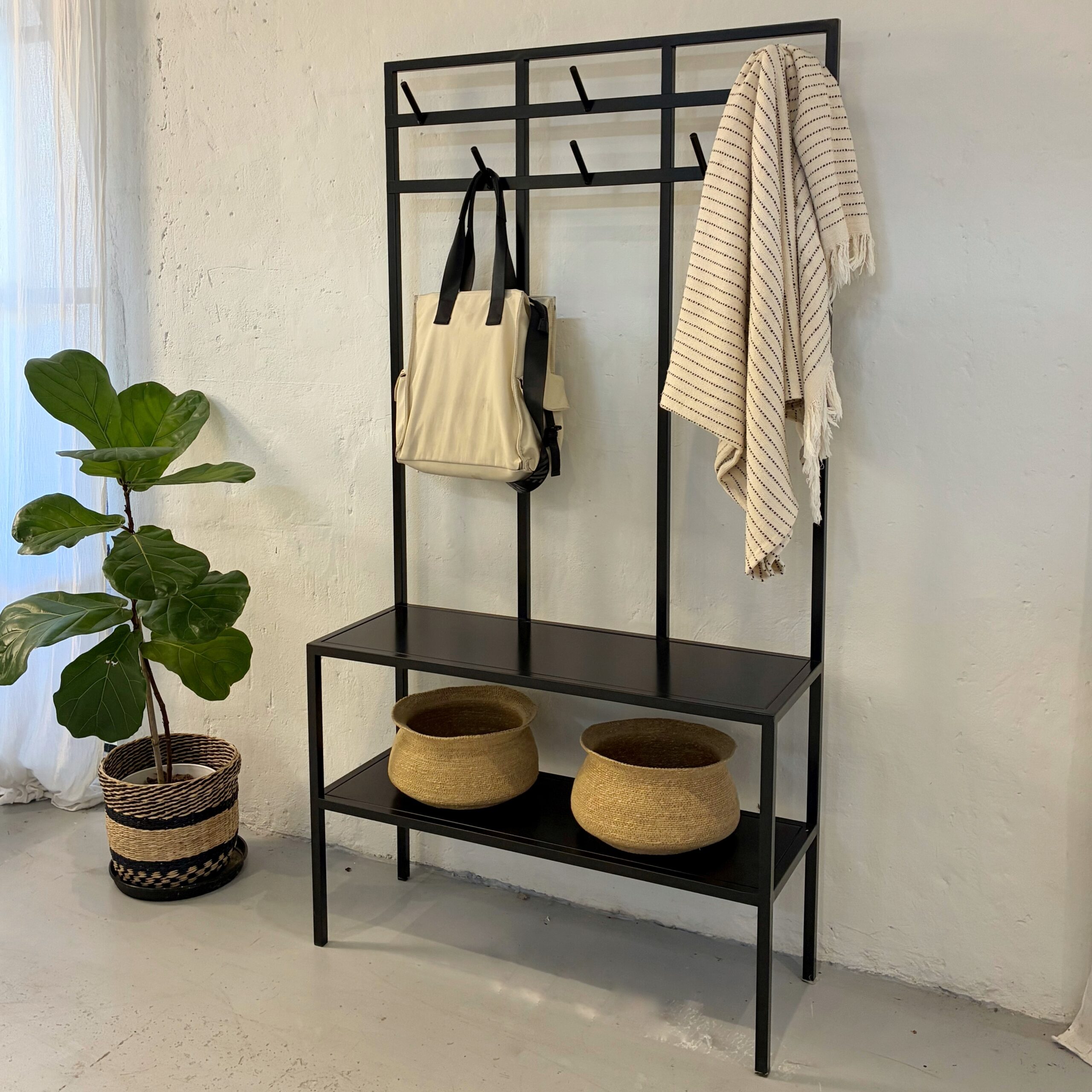 Recibidor con Alzada – Chapa Pintado en negro. Diseño minimalista y funcional, este recibidor está realizado en estructura de chapa pintada en color negro. Incluye una alzada con barras horizontales superiores y ganchos para colgar, ideal para abrigos, bolsos o accesorios. Su base ofrece una superficie práctica para apoyar objetos y una repisa inferior para almacenaje adicional. Perfecto para organizar la entrada de tu hogar con un estilo moderno y elegante.