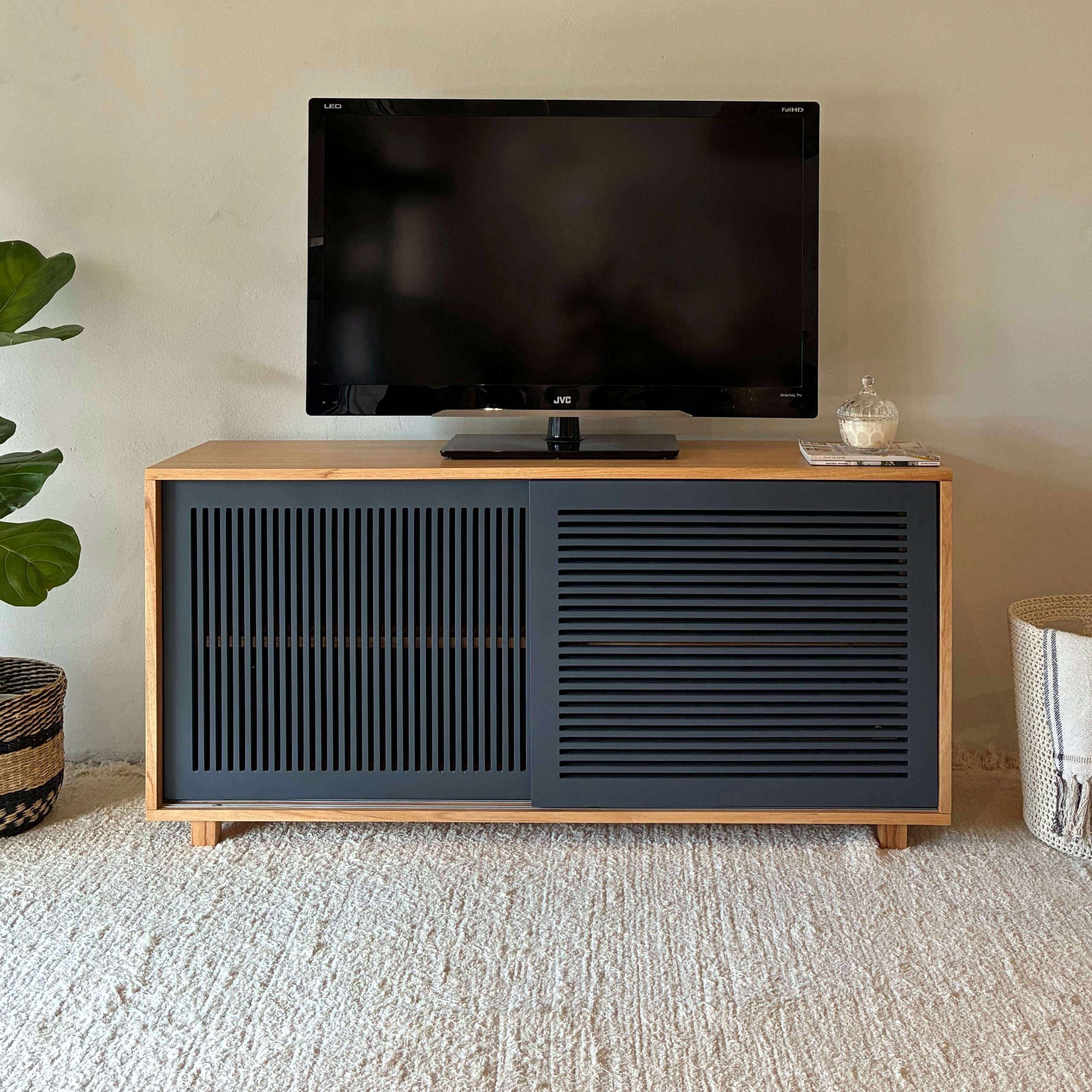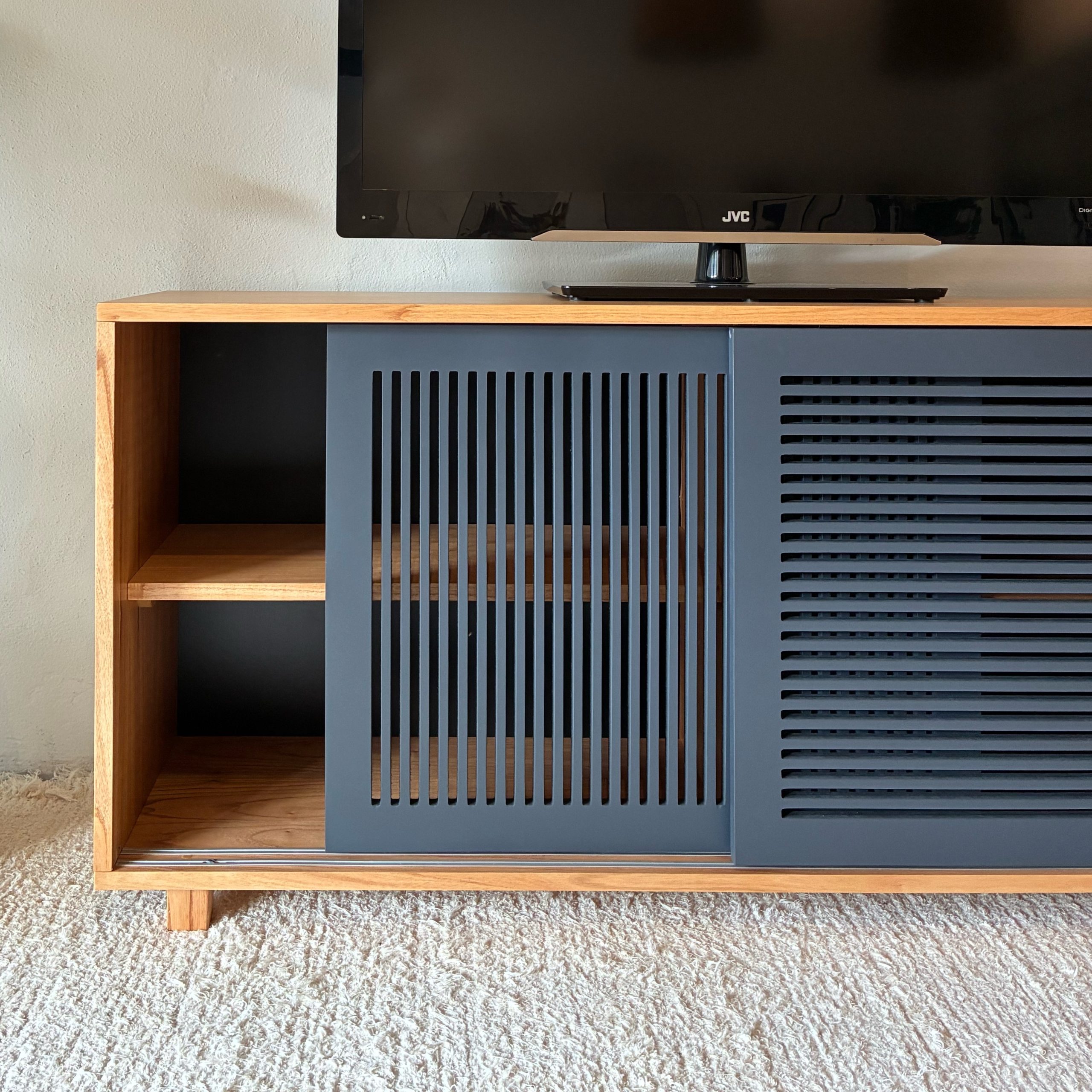 Nuestra mesa de TV Inglés combinada en paraíso de puertas corredizas blancas o grises permiten aprovechar toda su superficie en guardado.