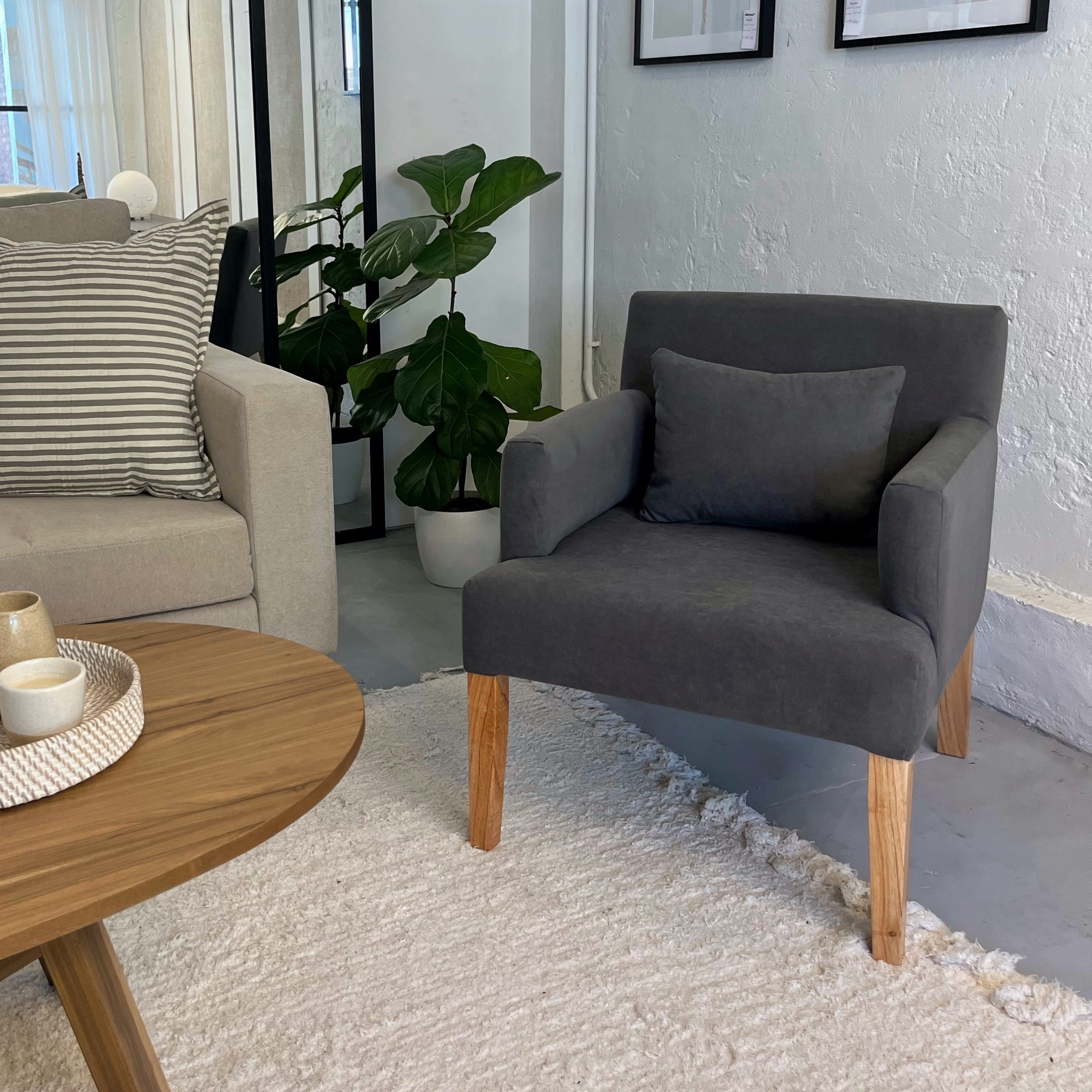 Cómodo sillón de un cuerpo tapizado, ideal como complemento en  livings  o dormitorios. Sus medidas se optimizan con su  respaldo y asiento cargado, acompañado por un almohadón riñonero. Disponible en distintas opciones de telas y colores.