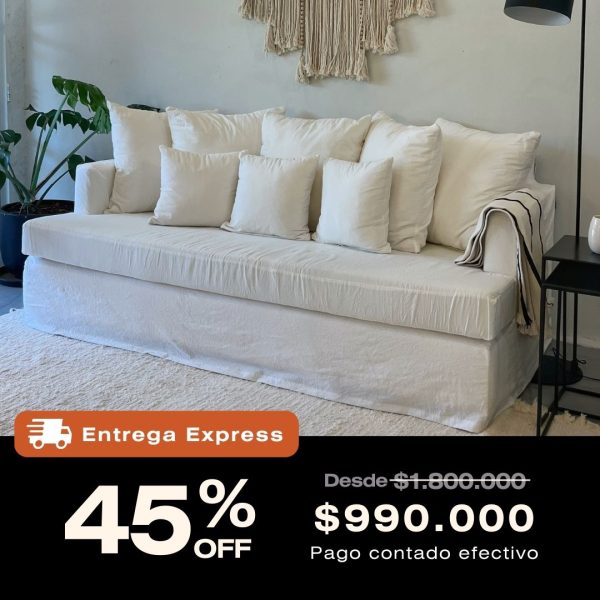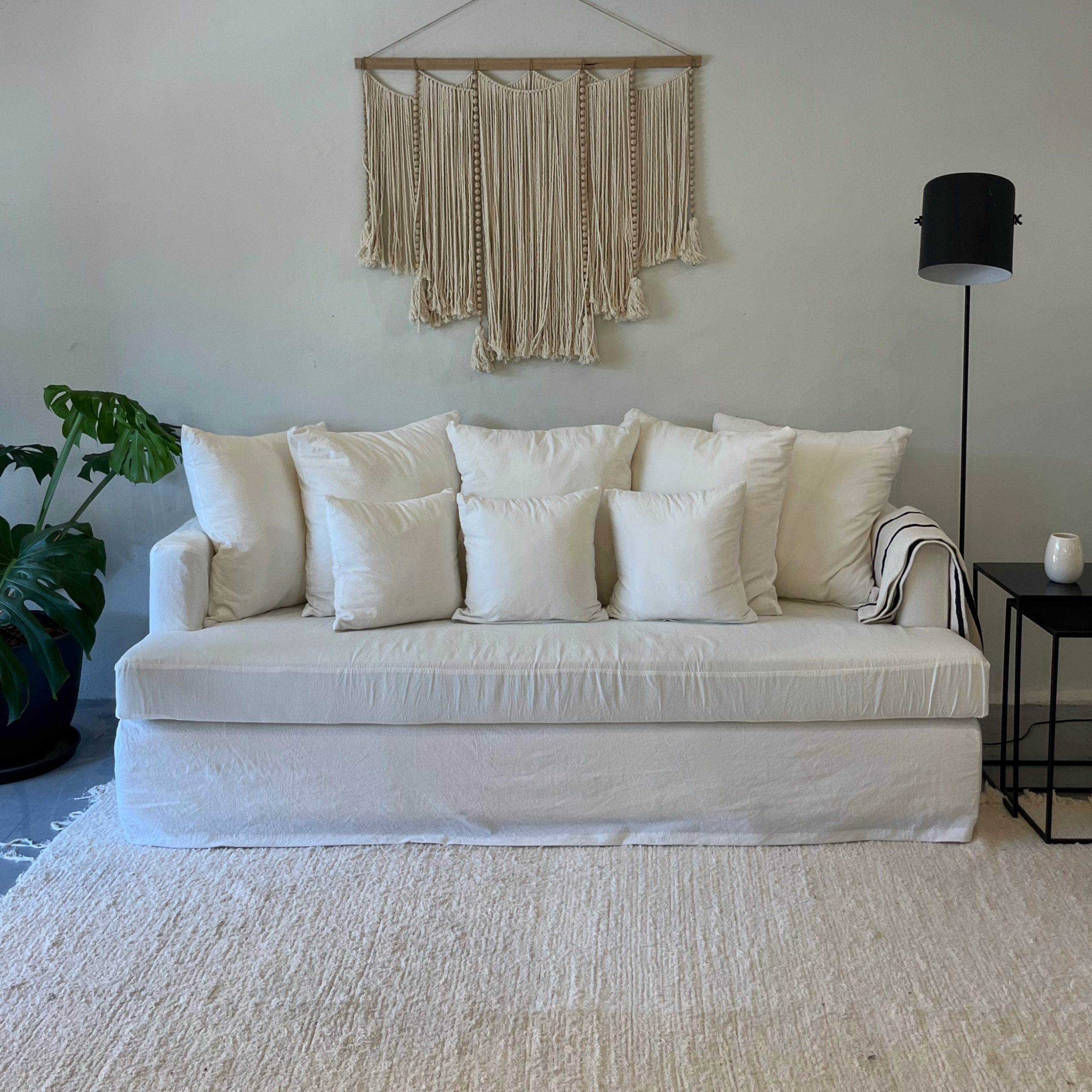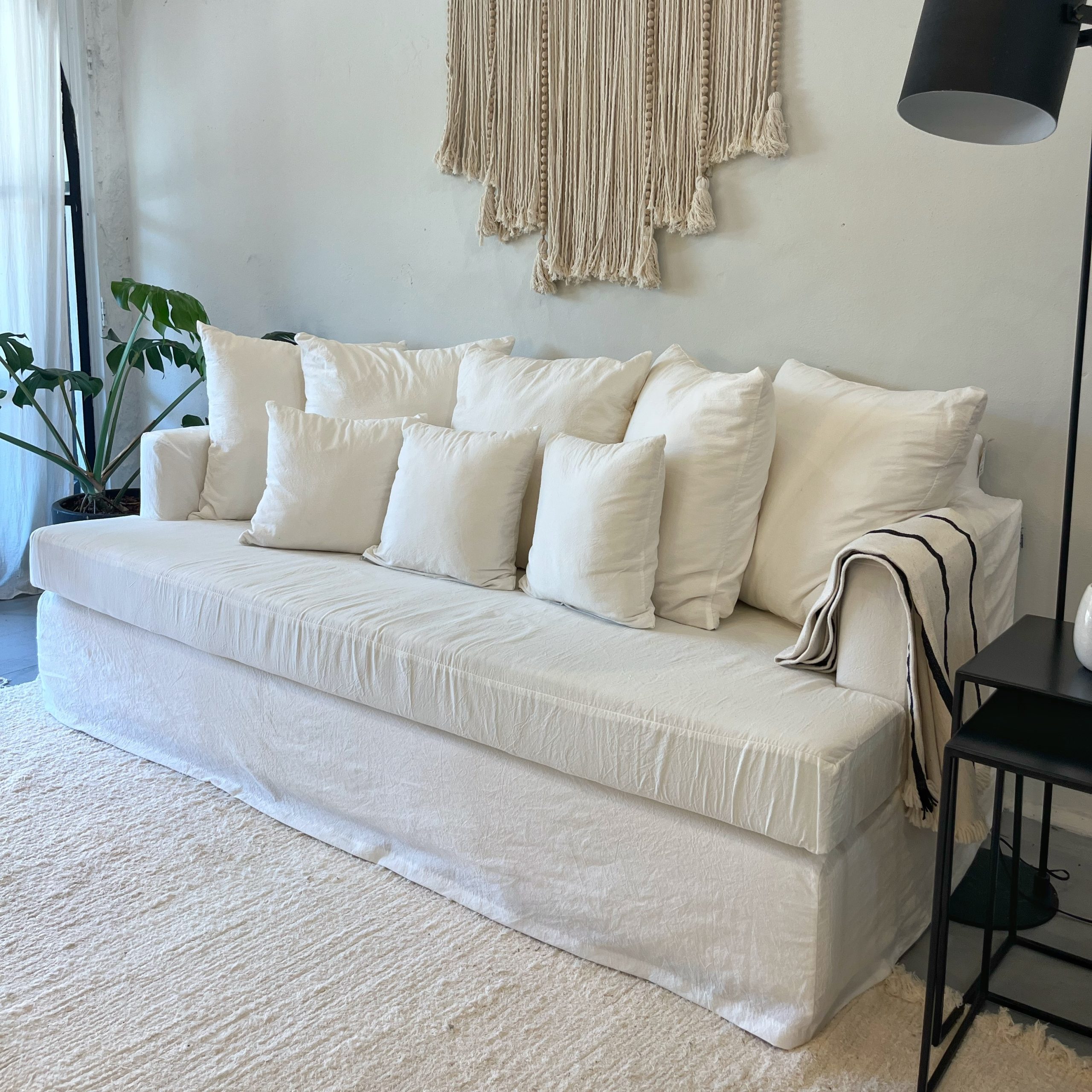 Sofá con Funda, con tres rasgos distintivos: sus apoyabrazos delgados y retraídos, el asiento de placa entera y su respaldo compuesto por 5 almohadones más grandes y 3 más pequeños. Disponible en género y color a elección entre lienzo rústico Off White y lienzo rústico Off Cream.