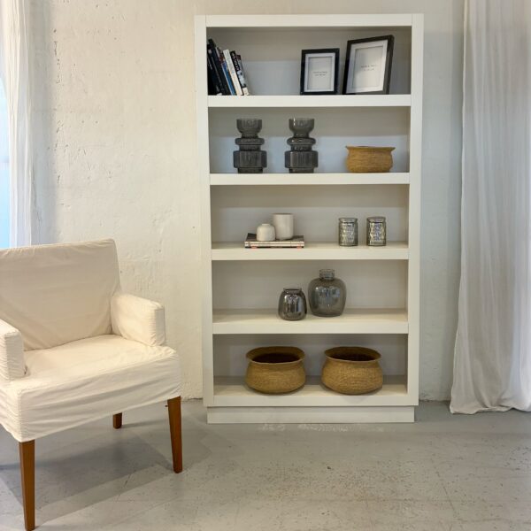 Una biblioteca de estilo contemporáneo, con cinco estantes amplios y estructura robusta. Disponible en color blanco, moka o paraíso, con opción de fondo o sin fondo, ofreciendo opciones para diversos estilos decorativos. Su diseño permite exhibir objetos decorativos y libros, aportando orden y estética al espacio.