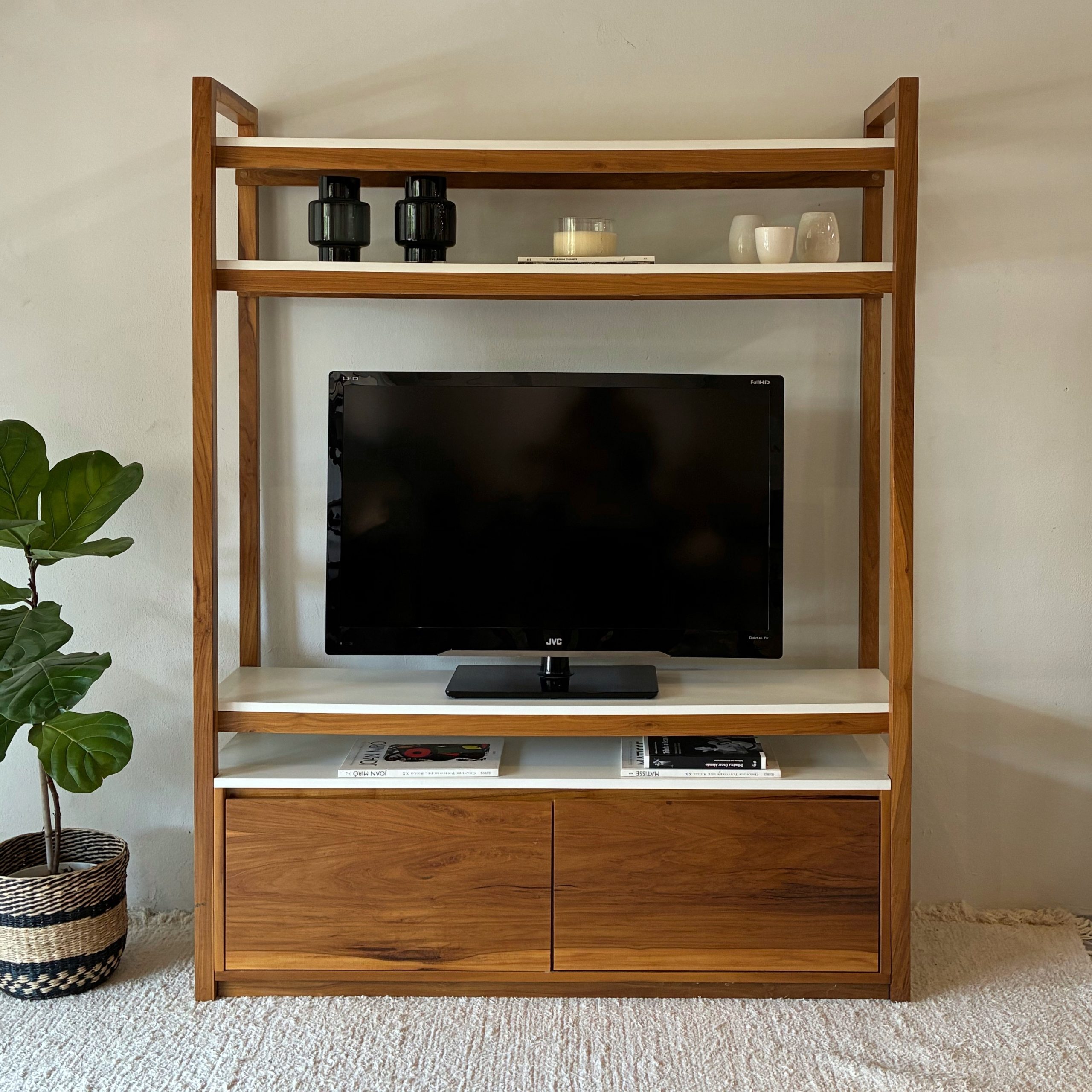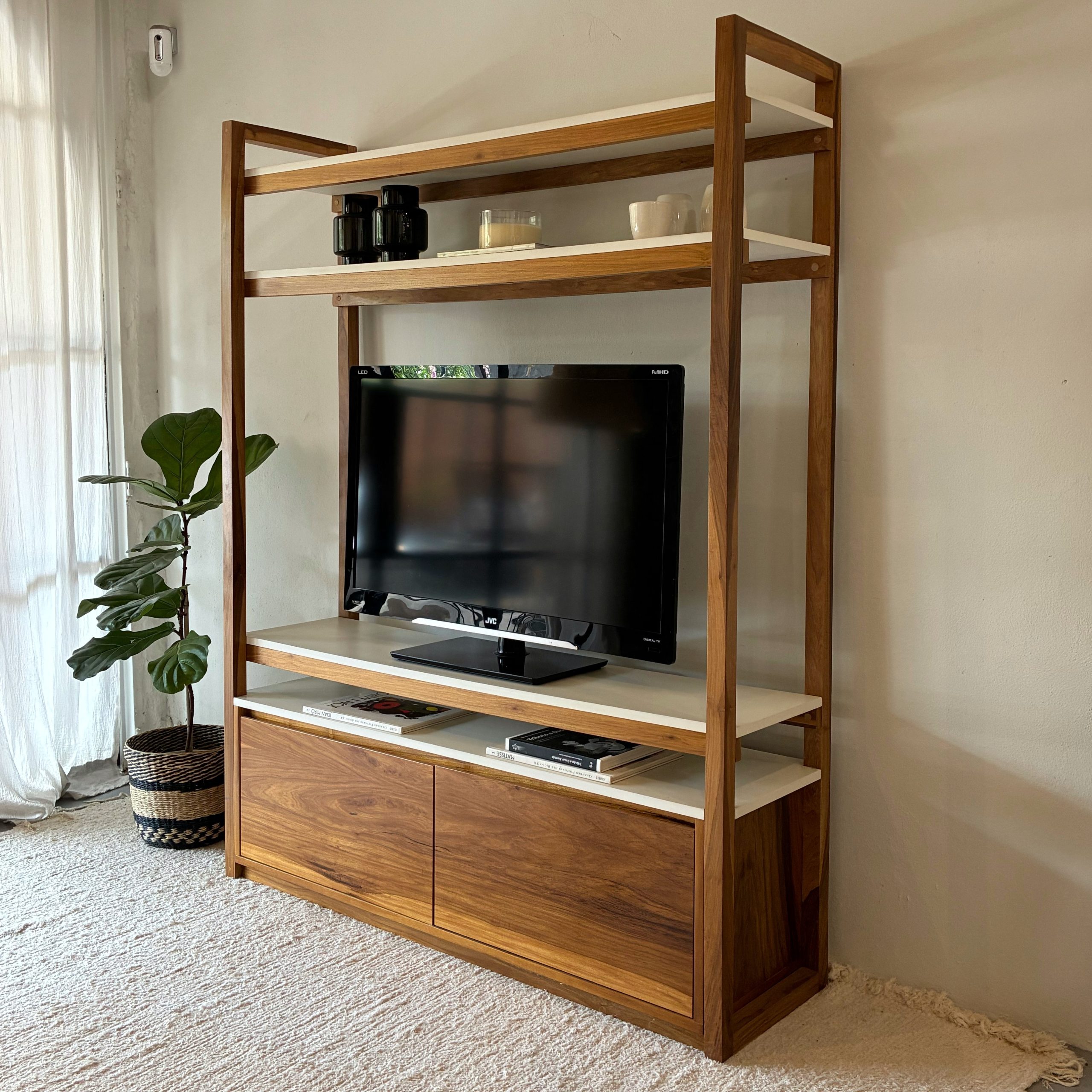 Ideal para múltiples usos esta Estantería está realizada en Peteribí y laqueado Marfil. Su diseño la convierte en un mueble multiuso, con espacio para TV – Biblioteca y guardado en sus amplios cajones inferiores.